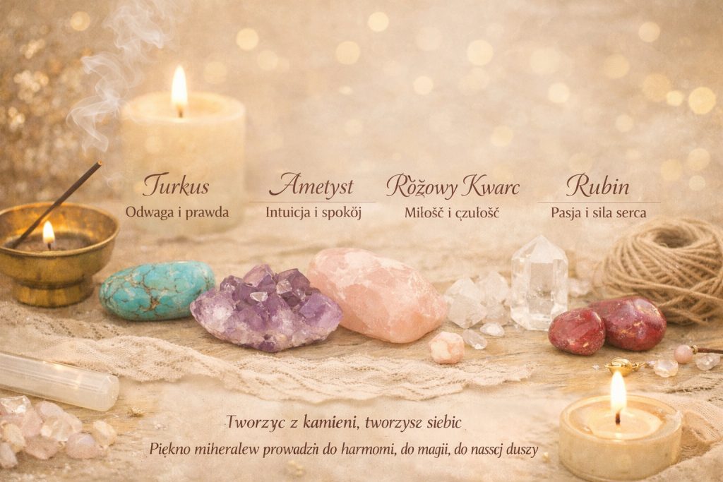 Turkus przypomina o odwadze mówienia prawdy. Ametyst koi myśli i otwiera intuicję. Rubin roznieca ogień serca, a kryształ górski oczyszcza i wzmacnia to, co w Tobie najczystsze. Szafir przynosi klarowność, a różowy kwarc — czułość i miłość do siebie.