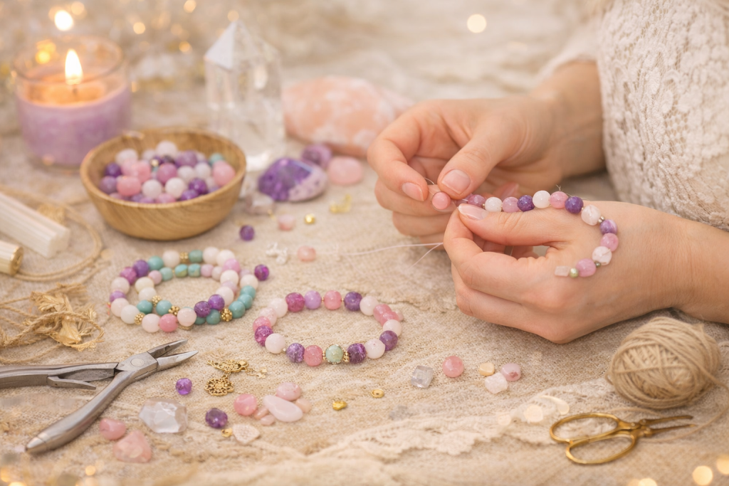 Pracujemy z różnymi formami rękodzieła — od biżuterii z minerałów, przez glinę, po techniki dekoracyjne — ale każda z nich prowadzi do tego samego miejsca: do wewnętrznej ciszy, w której kobieta może usłyszeć siebie naprawdę.